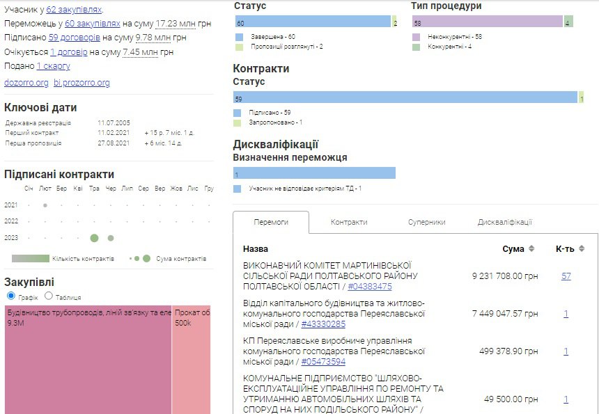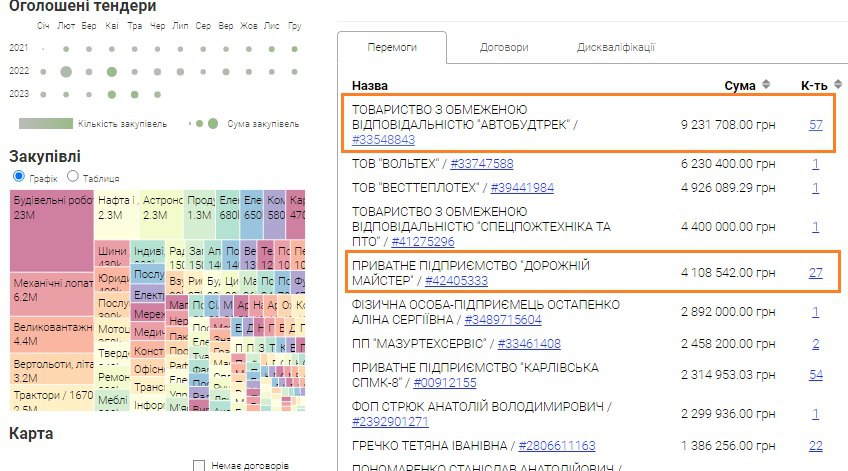 Першу державну угоду ТОВ “АВТОБУДТРЕК” підписало через 15 років після реєстрації. За короткий проміжок часу фірма стала топпідрядником виконавчого комітету Мартинівської селищної ради. Так, згідно з даними порталу Clarity Project, лише у 2023 році між ними укладено 57 угод на загальну суму 9,23 млн грн. Частина з них – на ремонт доріг у самій Мартинівці.