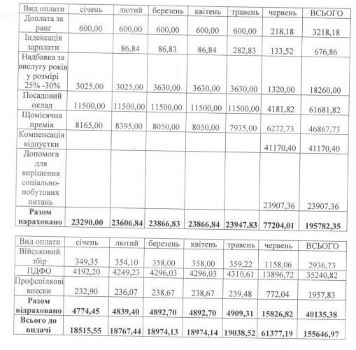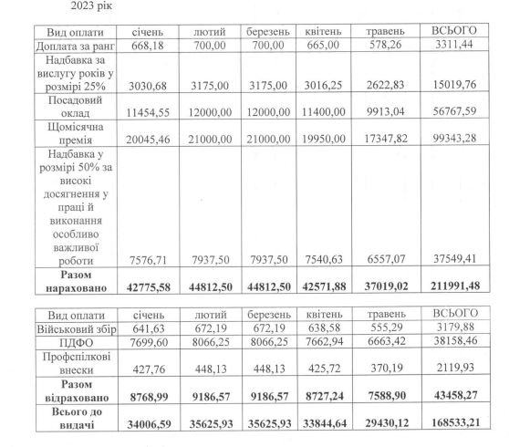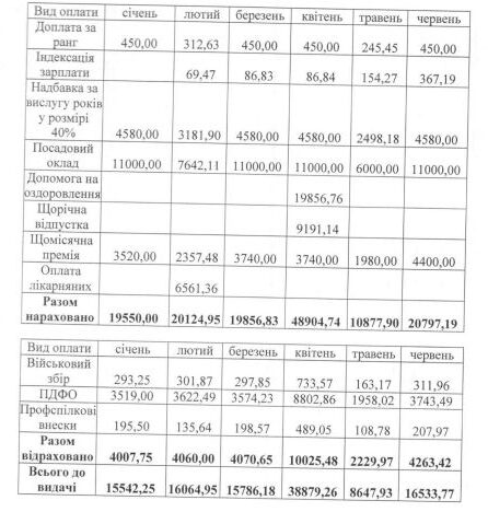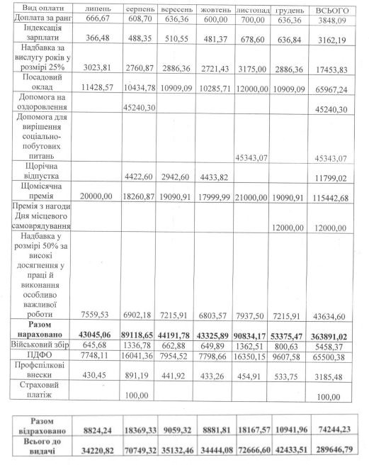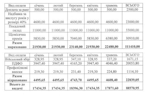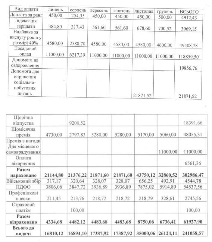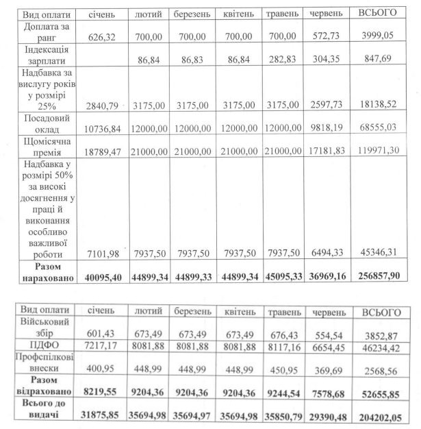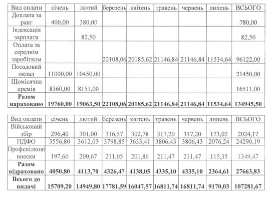 Оклад заступника був 11 000 гривень. Він отримав доплату за ранг та премію лише у січні та лютому 2022 року. За 7 місяців 2022 року на посаді чиновника отримав загалом 107 281 грн.