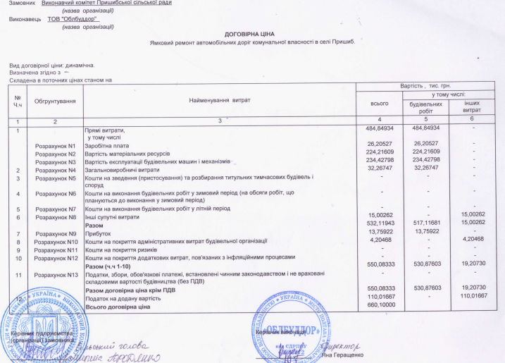 На прямі витрати мають виділити 484,8 тис. грн, з них на заробітну плату – трохи більше 26 тисяч гривень. На прибуток підрядника припадає 13,7 тисяч гривень. Податок на додану вартість складає 110 тисяч гривень.
