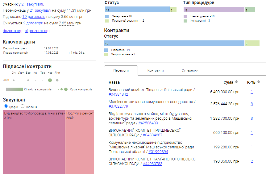 На сайті Clarity Project.info повідомляється, що на рахунку ТОВ “ОБЛБУДДОР” наразі 19 підписаних угод на загальну суму 3,66 млн грн та ще дві у процесі підписання. При чому перше державне замовлення фірма отримала через два місяці після реєстрації.