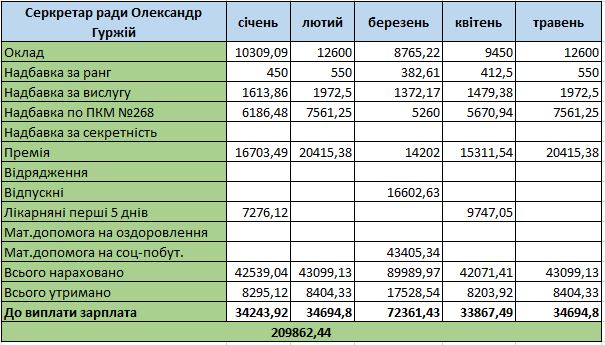 З січня по травень громада Миргорода сплатила «на руки» своїм п’яти головним посадовцям приблизно 1 млн 350 тисяч гривень.
