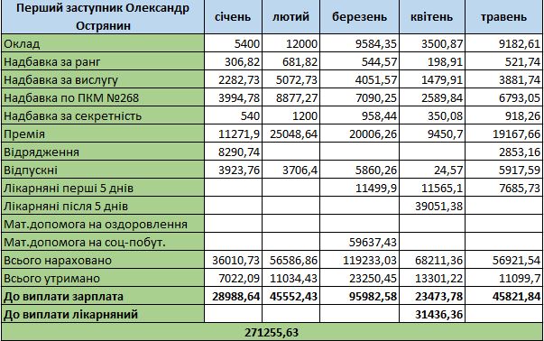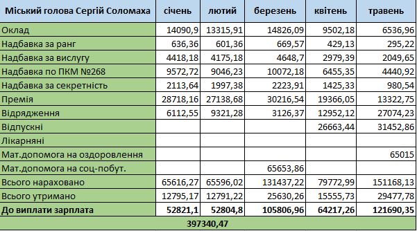 Мер двічі отримав відпускні у квітні та травні. У березні та у травні йому нарахували матеріальну допомогу на соціально-побутові питання та на оздоровлення (по 65 653 та 65 015 грн відповідно).