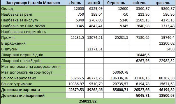 Щомісячно після сплати податків Наталія Молочко отримувала від 20 до 85 тисяч на місяць. Найвищу зарплату посадовиця отримала у березні – 85 тисяч 600 гривень, коли отримала матеріальну допомогу.