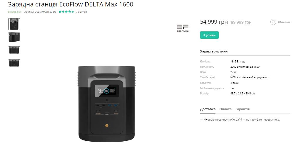 Зарядну станцію EcoFlow DELTA Max 1600 виконком придбав за  68 256 грн. На сайті офіційного авторизованого магазину EcoFlow в Україні така коштує 54 999 грн.