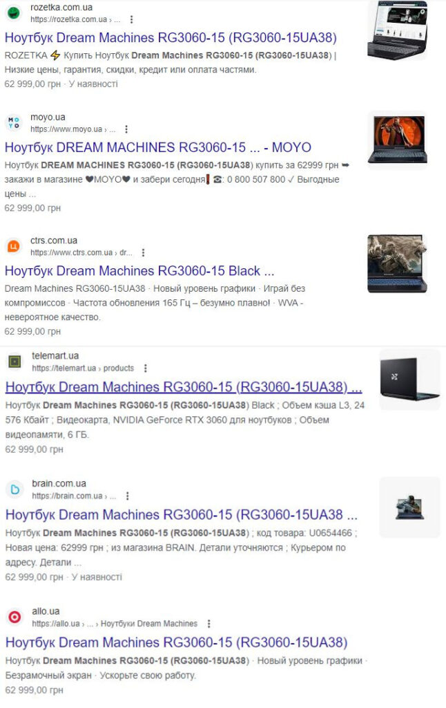 Так, ТОВ “Активбуд-М” поставить 15 ноутбуків Dream Machines RG3060-15 (RG3060-15UA38) по 99 072 гривні кожен. Загальна вартість угоди – 1 486 080 грн. А ціни на такі ноутбуки в мережі стартують від 63 тис грн (тобто потенційна переплата з кожного ноутбука – приблизно 30 тис. грн).