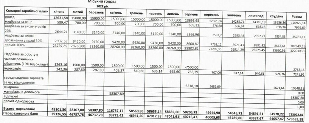 Усього за 2022 рік мер отримав 579 633 гривні. За шість місяців 2023 року – 257 270 грн.