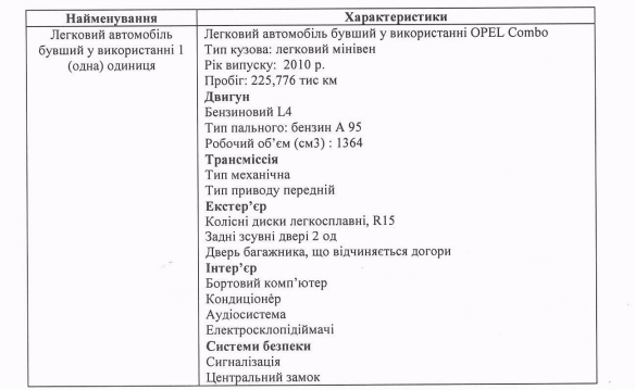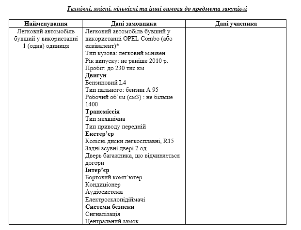 Технічні вимоги для вживаного автомобіля дуже деталізовані, бо ймовірно прописані під конкретного постачальника. Їх оприлюднили у першому замовленні. Так, замовнику потрібен легковий автомобіль (мінівен) марки OPEL Combo (або еквівалент): не раніше 2010 року випуску, пробігом до 230 тис. км, передньопривідним та з бензиновим двигуном L4. У автівці має бути: бортовий комп`ютер, кондиціонер, аудіосистема, електросклопідіймачі, центральний замок і сигналізація.