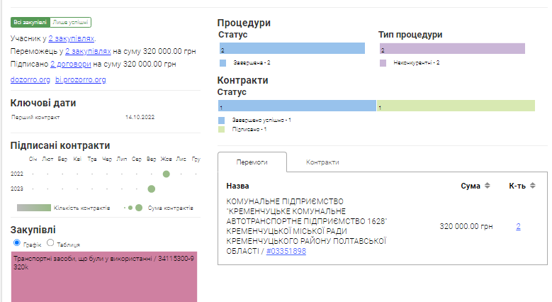 Це вже друга успішна угода на рахунку Савенкова і знову з кременчуцьким КАТП. Як повідомляється на порталі Clarity Project, перше замовлення він виконав не як підприємець, а як фізична особа. Той тендер було оголошено в жовтні 2022 року. Чоловік поставив на комунальне підприємство вживаний автомобіль ЗАЗ SENS, отримавши за нього 150 тисяч гривень. А через місяць після цього (14 листопада 2022 року) він зареєструвався, як ФОП.
