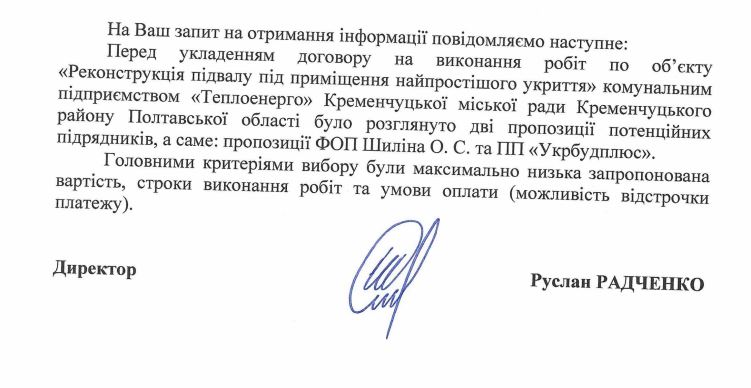 Мова йде про закупівлю, про яку МедіаДоказ писав 12 вересня. Напередодні кременчуцьке КП «Теплоенерго» підписало договір із приватною підприємницею Шиліною Оленою Сергіївною на реконструкцію підвалу під приміщення найпростішого укриття. Вартість робіт оцінили в 1 млн 485 тис. грн.