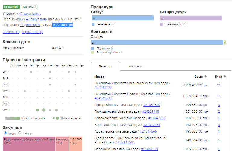 Загальна сума укладених угод складає 1 мільйон 19 тисяч 500 гривень. Варто зазначити, що окрема сума кожної з них не перевищує поріг у 200 тисяч гривень. Це фактично дозволило замовникам провести їх без торгів і без використання електронної системи закупівель.