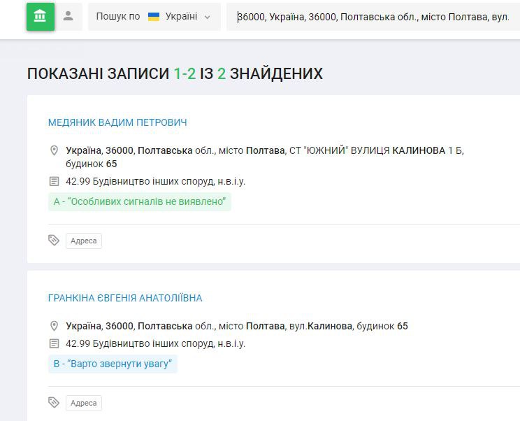 Але є одна цікавинка. В YouControl за адресою реєстрації дебютанта, видає ще одне підприємство. ФОП Гранкіна Євгенія Анатоліївна зареєстровано у Полтаві по вулиці Калиновій, 65, а за адресою Калинова 1 Б, будинок 65 базується ФОП — Медяник Вадим Петрович.