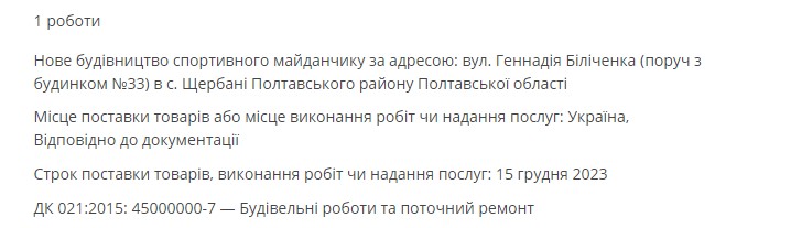 Уже сьогодні з системи prozorro стало відомо про другий підряд від управління ЖКГ. Цього разу ФОП має звести спортивний майданчик по вулиці Геннадія Біліченка. Ціна питання для бюджету громади — 1 060 906 гривень. В іншому все як і минулого разу: закупівля без конкурсу, договір, як і вимоги до робіт, відсутні.