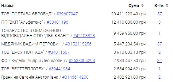 Якщо дивитися на закупівлі управління, то за підприємцем почесна 4-та сходинка, а вже Євгенія Грінкіна посідає 8-е місце за вартістю угод.