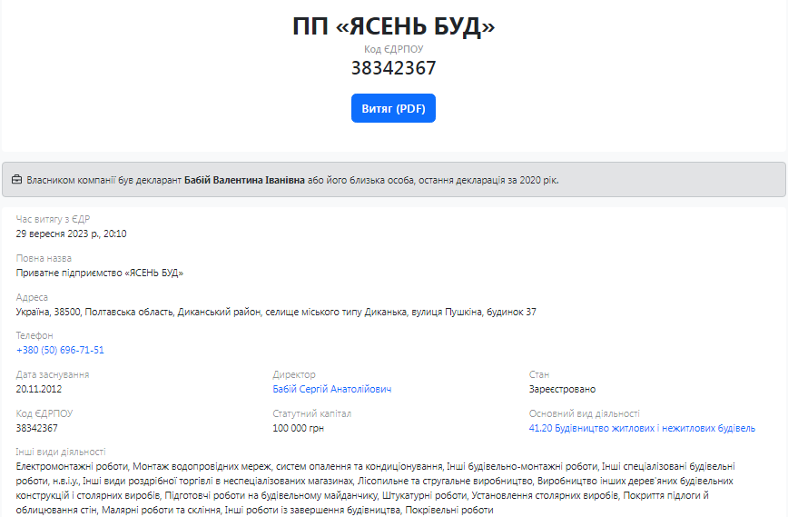 Примітно, що Сергій Бабій є директором фірми “Ясень Буд”, яка також неодноразово отримувала підряди від комунальних установ Диканьки, а також відділу освіти, молоді та спорту виконавчого комітету Чорнухинської селищної ради.
