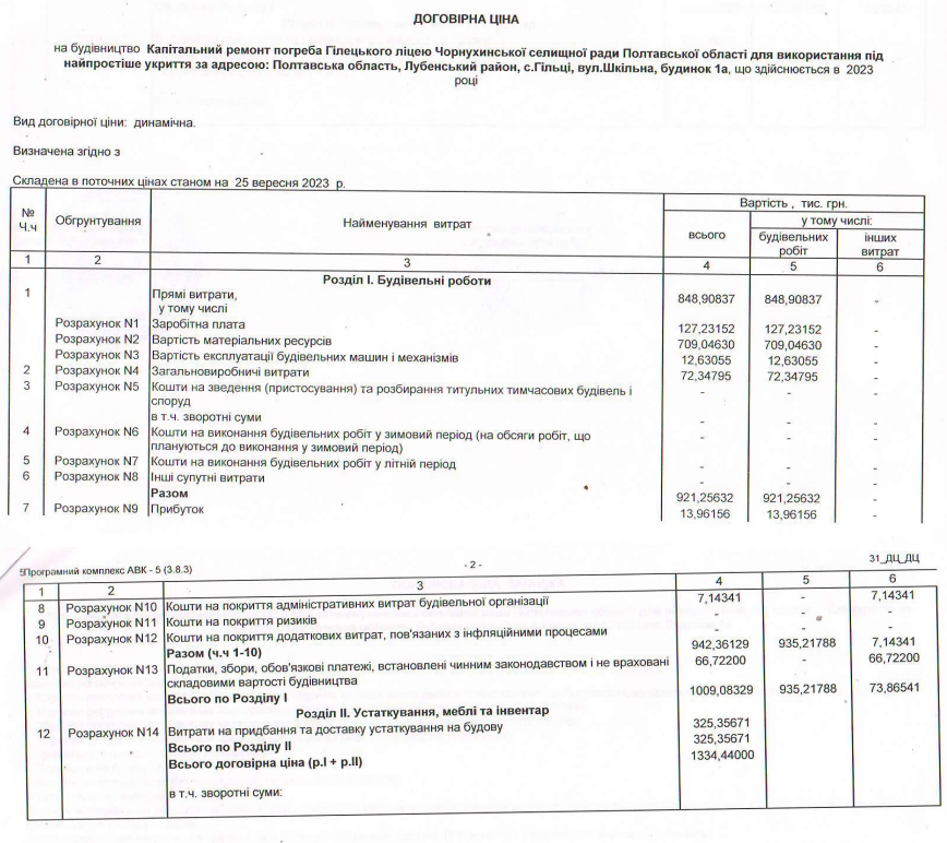 Прибуток підрядника із загальної суми становить – 13,96 тис. грн. Варто також зазначити, що договором передбачені витрати на придбання та доставку устаткування до майбутнього укриття – понад 325 тисяч гривень.