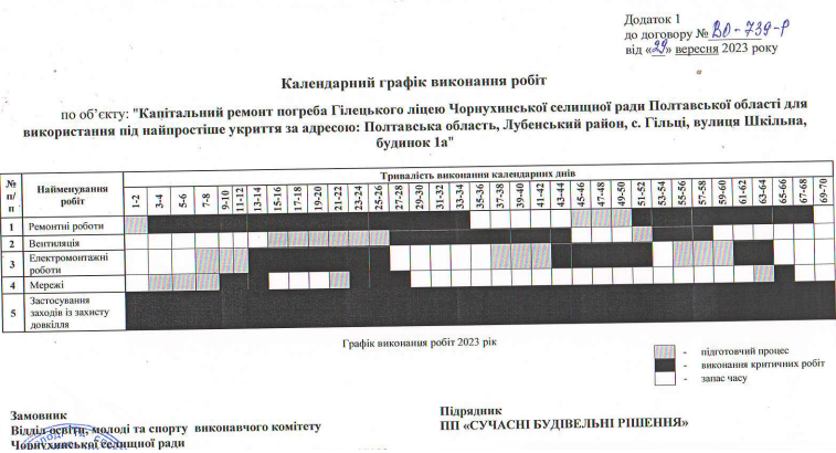 Також в угоді оприлюднений календарний план робіт, розбитий за днями. Загальний термін виконання капітального ремонту становить 70 днів. За цей час підрядник має виконати у погребі навчального закладу ремонтні та електромонтажні роботи, провести вентиляцію і мережі, а також застосувати заходи із захисту довкілля. Завершення робіт очікується не пізніше 25 грудня 2023 року.