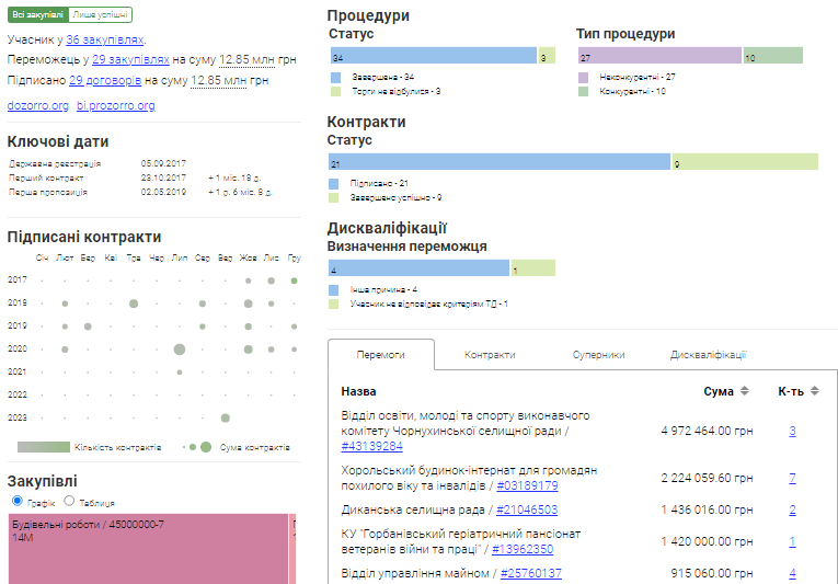 Як повідомляється на сайті Clarity Project, за час свого існування компанія “Сучасні будівельні рішення”, яка ремонтуватиме погріб у селі Гільці, підписала 29 угод на державні замовлення на загальну суму 12,85 млн грн. Більшість із них укладено без використання електронної системи.
