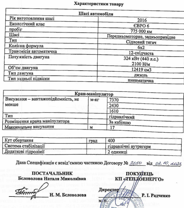 Угоду КП “Теплоенерго” уклало з ФОП Бєловоловою Наталею Миколаївною. Вона має поставити на кременчуцьке комунальне підприємство вантажний автомобіль з краном маніпулятором MAN TGS 24.440 із майже відповідними до запиту замовника характеристиками. Як повідомляється в договорі, пробіг автомобіля, який в результаті придбали комунальники, менший – 770 000 км, а об`єм двигуна збігається – 12 419 см.кв.