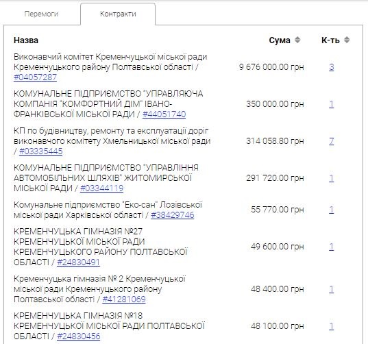 Найбільш вартісними для ТОВ «Дормаш Груп» були угоди із виконавчим комітетом Кременчука – між ними укладено 3 контракти на майже 9,7 млн грн.