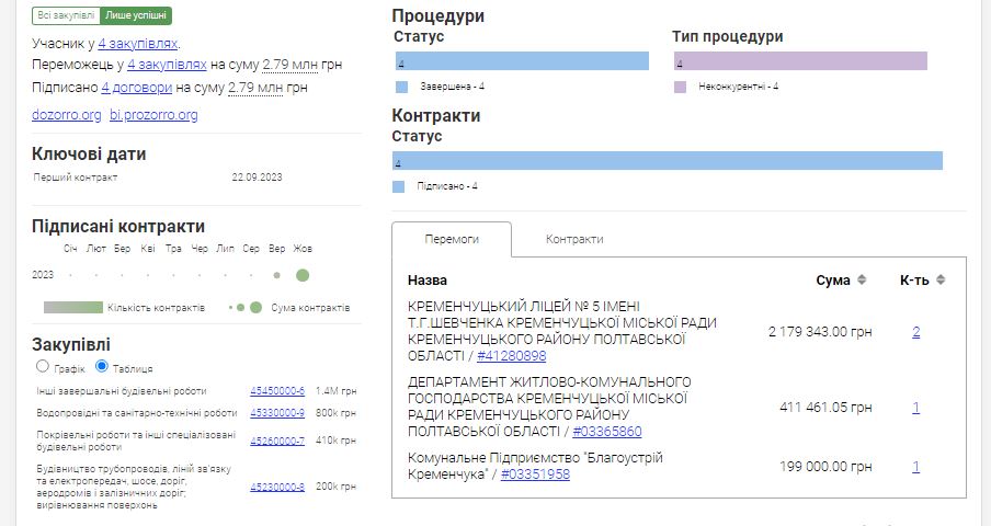 Згідно з даними аналітичного порталу Clarity Project, за трохи більше місяця підприємницької діяльності ФОП встиг укласти 4 контракти на державні замовлення. Усі чотири угоди визнано неконкурентними. Їхня загальна вартість складає 2 млн 789 тис. грн. Причому першу угоду приватний підприємець підписав із КП «Благоустрій Кременчука» через тиждень після реєстрації.