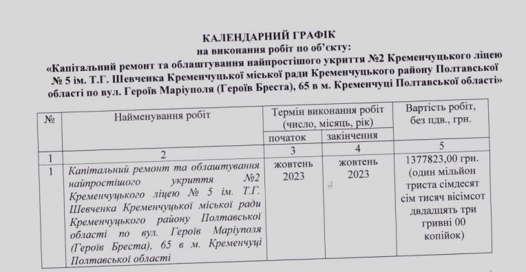 На ремонт укриття ліцею №5 у Кременчуці за 1,3 млн найняли ФОП-новачок
