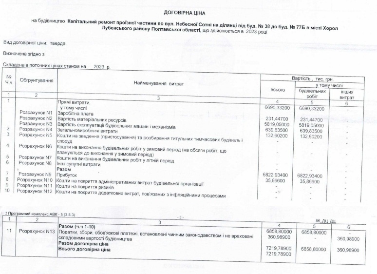 У договірній ціні повідомляється, що на придбання матеріальних ресурсів передбачена найбільша частина коштів – понад 5,8 млн грн, на заробітну плату – 231,44 тис грн. Вартість експлуатації будівельних машин і механізмів складає майже 640 тис грн, а загальновиробничі витрати – трохи більше 132 тис грн. Прибуток підрядника з даного державного замовлення складає понад 35 тисяч гривень