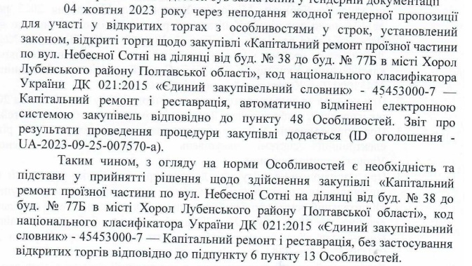 Саме це дозволило виконкому Хорольської міськради оголосити замовлення вдруге, але провести його вже без торгів і з підрядником, знайденим поза електронною системою.