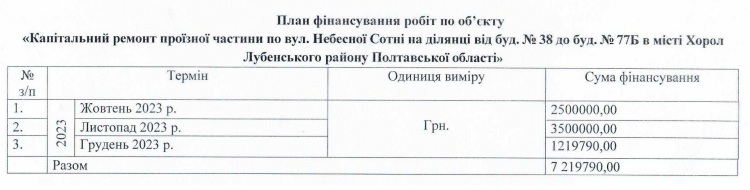 25 жовтня виконавчий комітет Хорольської міської ради Лубенського району підписав угоду на капітальний ремонт проїзної частини по вул. Небесної Сотні на ділянці від буд. № 38 до буд. № 77Б в місті Хорол. Про це повідомляється на сайті Prozorro.