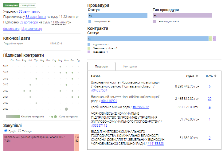 Загалом із підприємцем було укладено 32 угоди на державні замовлення на суму 11,06 млн грн. Серед замовників був не тільки виконком Хорола, а й Гребінківська міська рада та виконавчий комітет Чорнобаївської селищної ради.