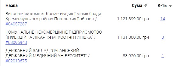 За даними clarity-project, виконком Кременчука з ФОП уклав найбільше угод – 14 – на загальну суму 1,1 млн грн. Звернемо увагу, що угод на таку суму від мерії Кременчука підприємиця отримала за 4 місяці.