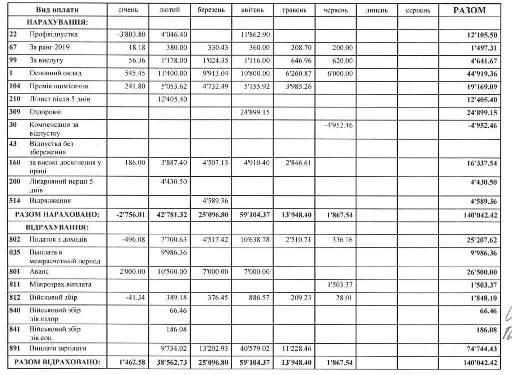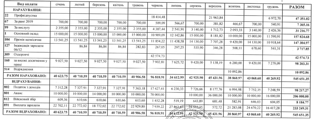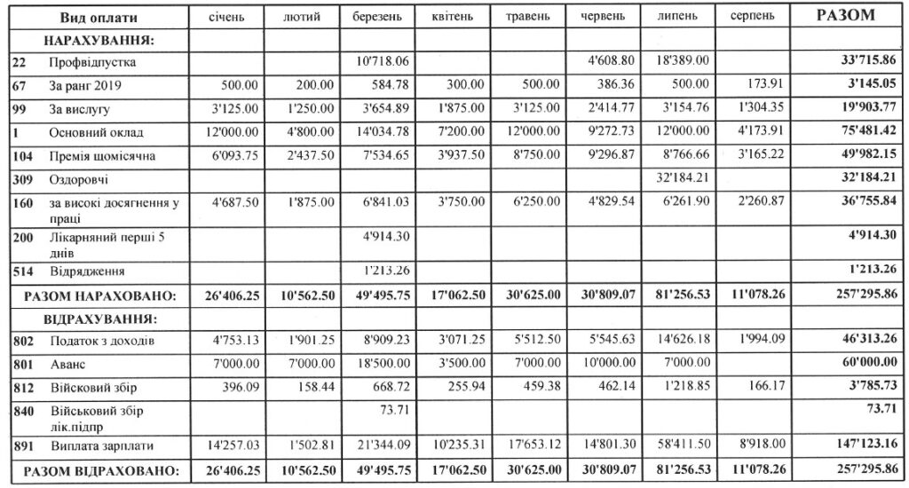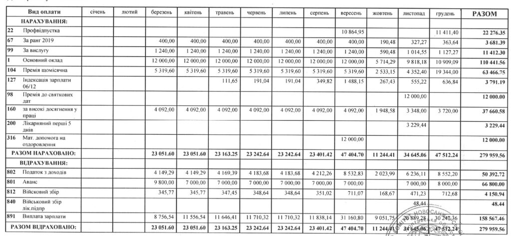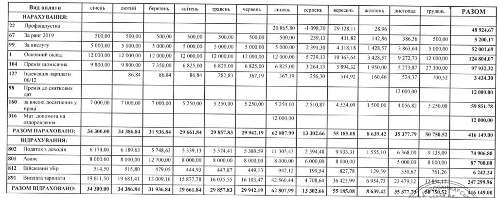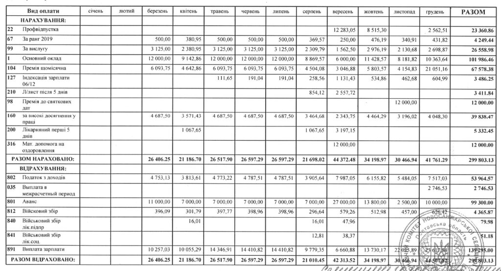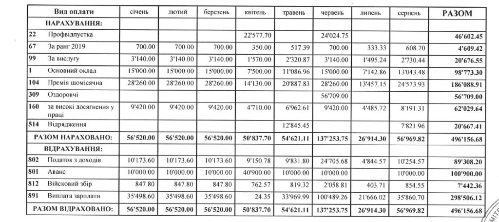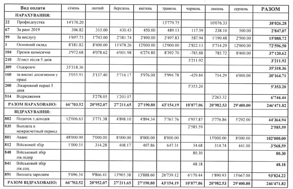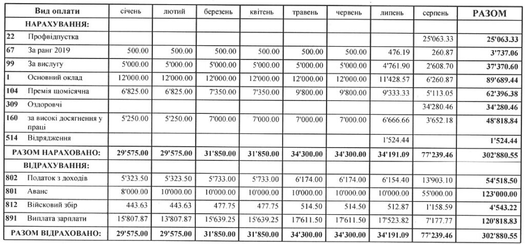 Найбільше коштів нарахували у липні цього року – понад 65 тис. грн, сюди входить і премія, і відпускні, і матеріальна допомога, і надбавки. Середньомісячна зарплатня заступника (без урахування сплати податків) складає 24 тисяч гривень.