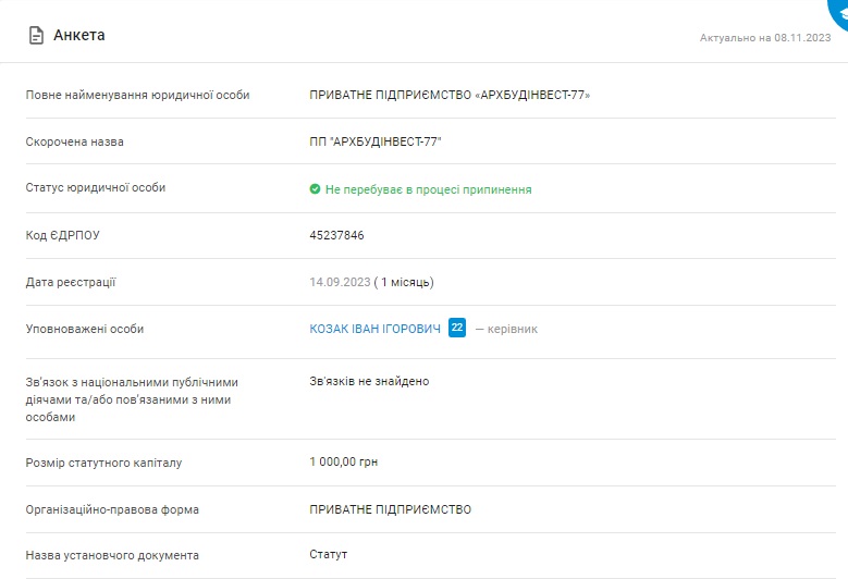 Договір підписали з приватним підприємством “АРХБУДІНВЕСТ-77”. Як повідомляється на порталі Youcontrol, компанія зі статутним капіталом 1000 грн зареєстрована в селі Покровське Полтавського району. Зареєстрували її нещодавно – 14 вересня 2023.