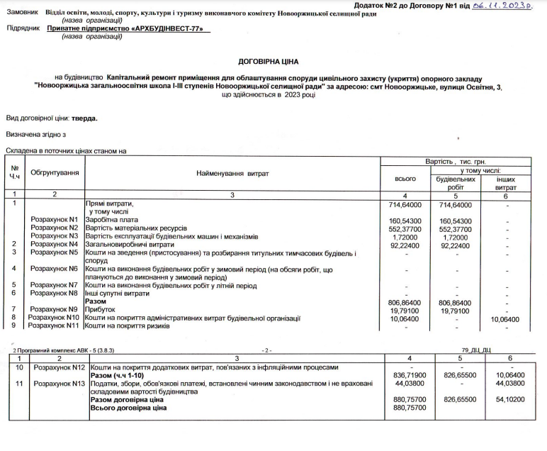 У ціну договору включені: прямі витрати – 714,640 тис. грн, із яких вартість матеріальних ресурсів складає 552,377 тис. грн. Прибуток підрядника становить 19 тисяч 791 гривень.