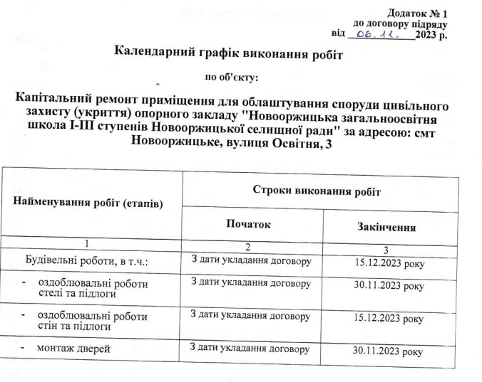 Як повідомляється в угоді, підрядник має виконати роботи не пізніше ніж до 25 грудня 2023 року, дотримуючись проєктної документації. У календарному графіку йдеться, що точною датою завершення робіт є 15 грудня 2023 року: оздоблювальні роботи і монтаж дверей підрядник має завершити до 30 листопада, а оздоблювальні роботи стін і підлоги – до 15 грудня 2023 року.