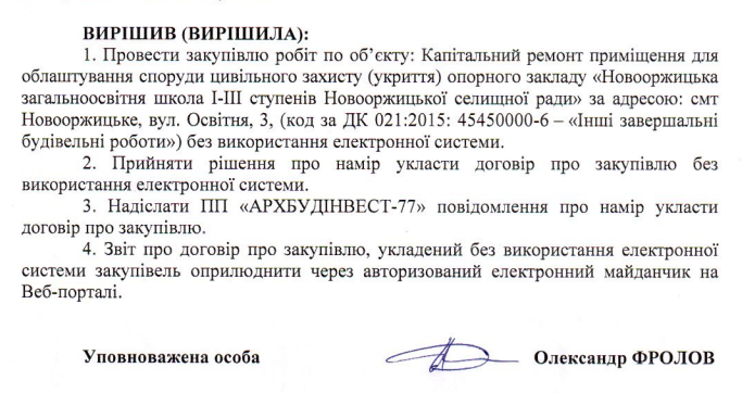 Вартість робіт складає 880 тисяч 757 гривень. Закупівлю провели без використання електронної системи, підписавши прямий договір із підрядником. Про прийняття уповноваженою особою відповідного рішення вказується у оприлюдненому протоколі.