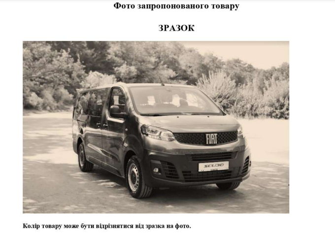 Фірма запропонувала фургон марки FIAT, 2023 року випуску, з об`ємом двигуна 1997 см.куб, механічною коробкою передач та переднім приводом. За комплектацією автомобіль повністю відповідає заявленим характеристикам замовника.