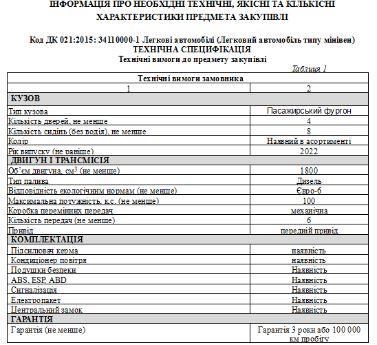 Згідно з технічними характеристиками, це має бути передньопривідний пасажирський фургон, не раніше як 2022 року випуску, з об`ємом двигуна не менше 1800 см.куб. та з механічною коробкою передач. Заправлятися транспортний засіб має дизелем. Щодо комплектації, то вона має бути повна, зокрема в автівці повинен бути кондиціонер. Учасник підтверджує гарантійні зобов’язання на строк 3 роки або 100 тис. км пробігу, про що у складі тендерної пропозиції надається гарантійний лист у довільній формі.