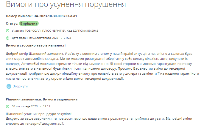 Варто зауважити, що 3 листопада від учасника торгів була подана вимога про внесення змін у тендерну документацію стосовно обов`язкової наявності автомобіля у дилера. Він зауважив, що, у зв`язку з воєнним часом, “ситуація із наявністю в салонах будь-яких марок автомобілів складна”, і вони не можуть зберігати в себе велику кількість автомобілів або викуповувати їх наперед. Натомість ці автівки можна отримати тільки під замовлення, і вони гарантують постачання такого авто після підписання угоди. Вимогу учасника було задоволено, відповідні зміни в тендерну документацію внесли.