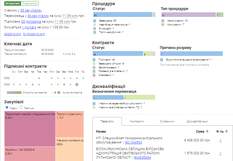 Повертаючись до фірми “СОЛЛІ ПЛЮС ЧЕРНІГІВ”, згідно з інформацією на сайті clarity-project, фірма уклала 55 угод на загальну суму 11,39 млн грн. Більшість із них були підписані шляхом прямої угоди, без проведення офіційної пороцедури торгів. Найбільш прибуткова угода підписана з полтавським КП “Спецкомбінат похоронно-ритуального обслуговування” – фірма постачила на підприємство три спеціалізовані катафалки загальною вартістю 6 млн 408 тис. грн. Відповідний договір було укладено 8 листопада цього року, про самий тендер написано на сайті видання “Полтавщина“.