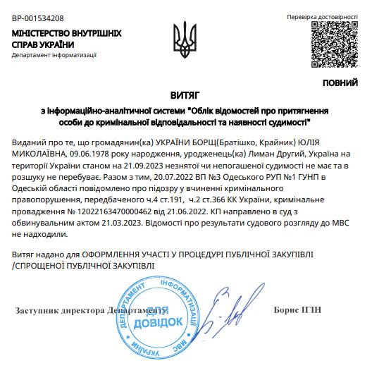 Угоду із підрядником обласний департамент підписав 29 вересня. На момент підписання угоди підрядник, точніше його директорка, фігурував у кримінальному провадженні. Ба більше – подаючи документи на торги, приватне підприємство надало витяг з Міністерства внутрішніх справ, де зазначено, що директорка має підозру у корупційному злочині – правоохоронцями Одеси їй було повідомлено підозру в кримінальному передбаченого ч.2 ст.366, ч.4 ст.191 КК України (службове підроблення, що спричинило тяжкі наслідки, а також привласнення, розтрата майна або заволодіння ним шляхом зловживання службовим становищем). А у березні 2023 року справу було передано до суду.