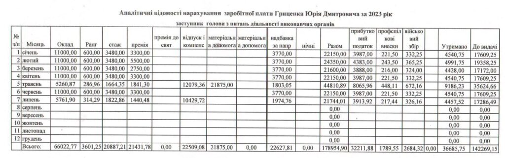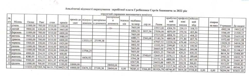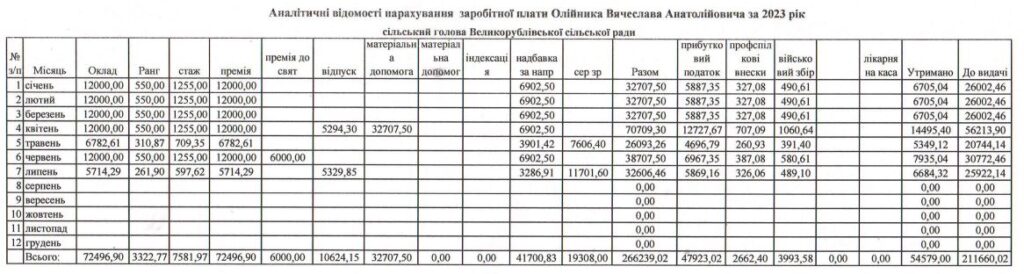 Найбільша зарплата в посадовця була в лютому (52 168 грн) та липні 2022-го (49 613 грн) за рахунок відпускних і матеріальної допомоги на оздоровлення та вирішення соціально-побутових питань. У першій половині 2023-го року сільський голова також отримав оздоровчі – у квітні йому нарахували 32 707 грн.