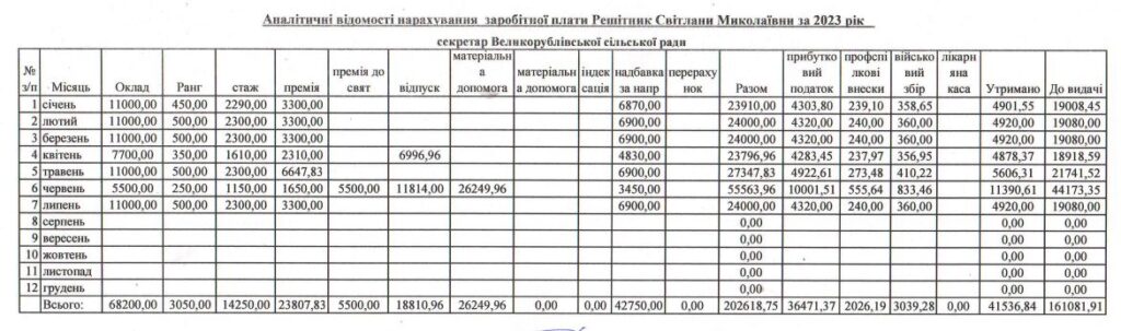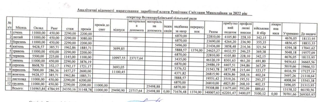 У відповіді на запит нам також надали дані щодо заробітної плати секретаря Великорублівської сільської ради – Світлани Решітник. Їй нараховували 11 тисяч гривень окладу, доплату за ранг, за напруженість та за вислугу років. Посадовиця також отримувала щомісячну премію (у розмірі від 2 200 6 200 грн) та одноразову у грудні 2022 року та червні 2023-го з нагоди свята.
