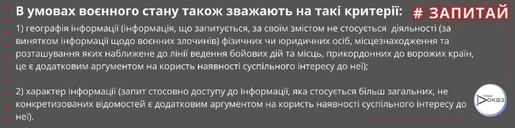 Як пояснює медіаюристка Інституту розвитку регіональної преси Оксана Максименюк, відстрочка у задоволенні запиту на публічну інформацію у зв’язку з введенням в Україні воєнного стану не може підлягати безумовному застосуванню і у всіх без винятку випадках.