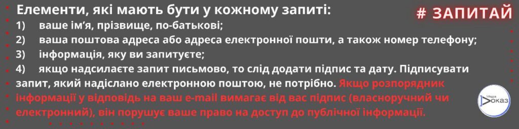 МедіаДоказ, коли відправляє запити, також вказує на початку запиту найменування та адресу розпорядника, до якого звертається, а також вказує в темі листа та на початку листа, що це запит (інформаційний запит, запит на публічну інформацію), щоб розпорядник не сплутав його зі зверненням.
