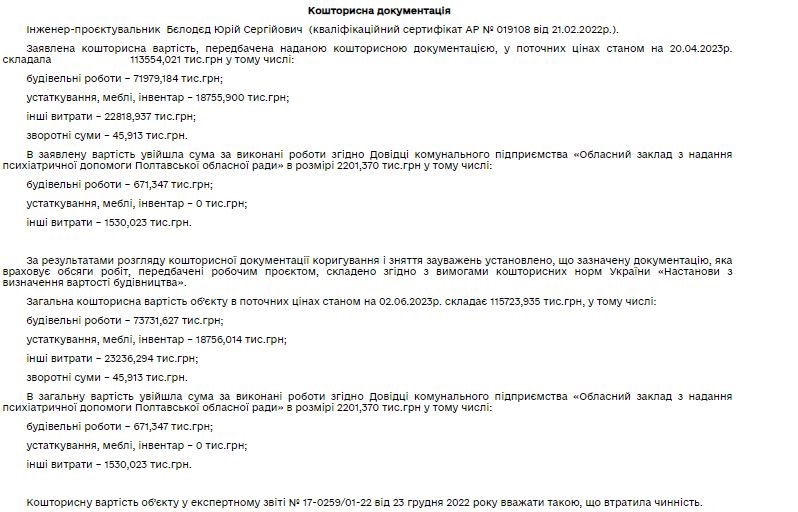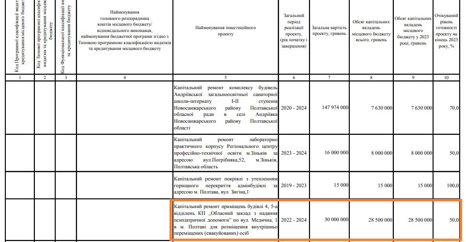 23 грудня 2022 року на двадцятій позачерговій сесії Полтавської облради приймали бюджет області на 2023 рік. Серед інших інвестиційних проєктів був капітальний ремонт будівлі обласного психіатричного закладу для розміщення внутрішньо переміщених (евакуйованих) осіб. Вартість ремонту оцінили в 30 млн гривень, з яких обсяг капітальних вкладень місцевого бюджету у 2023 році складав 28,5 млн грн.