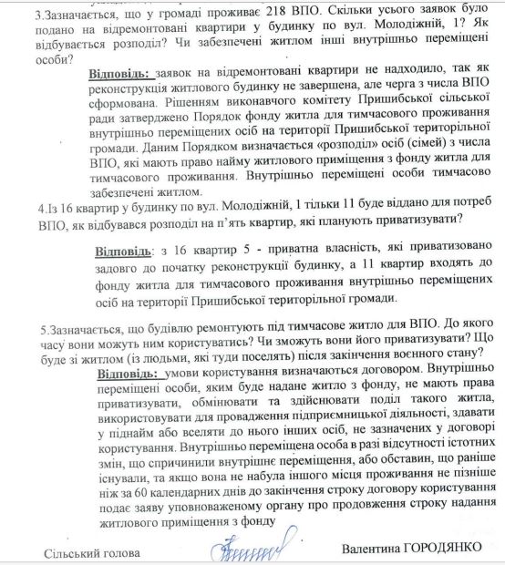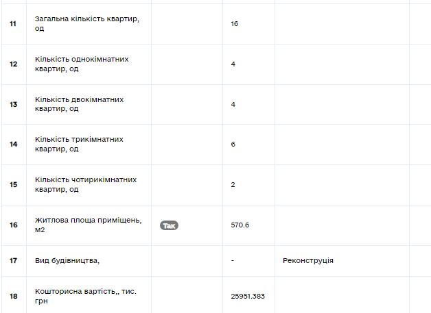 Виявилось, ці квартири не планують віддавати під житло для ВПО. У відповіді на запит Валентина Городянко повідомила, що справді лише 11 квартир входять до фонду житла для тимчасового проживання ВПО, а інші 5 – це приватна власність, яку приватизовано задовго до початку реконструкції будинку.