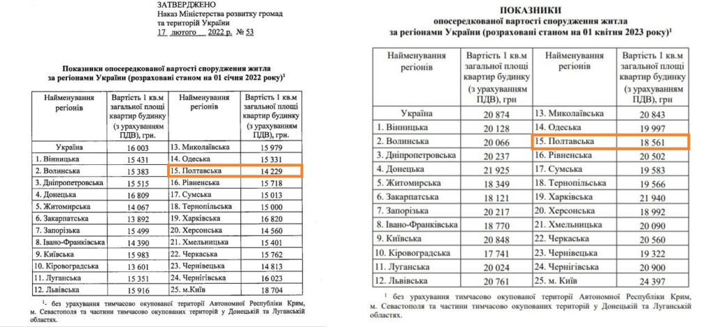 Цю цифру цікаво порівняти із даними Уряду та Міністерства розвитку громад. У 2022 Уряд видав постанову № 495, яка регулюватиме, як буде сформований фонд житла для тих, хто його втратив, а Міністерство розвитку громад встановило опосередковану вартість за 1 квадратний метр спорудження житла по регіонах.