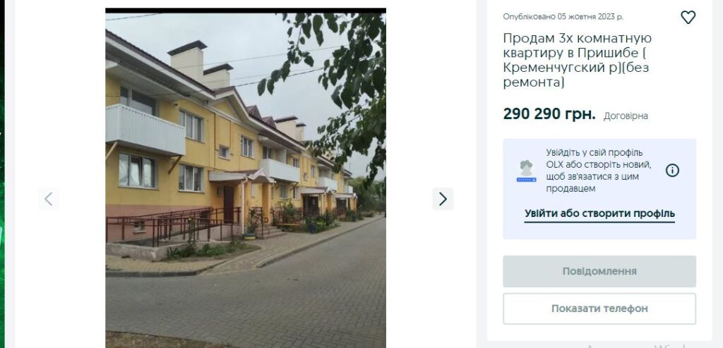Ми також знайшли на платформі онлайн-оголошень ОLX об’яву про продаж трикімнатної квартири у самому Пришибі. Причому мова йде помешкання у будинку по вул. Молодіжна, 6. Це, як і будинок № 1, що реконструюють для ВПО, один із семи будинків, що належали держсільгосп сільськогосподарському підприємству і були передані Пришибській сільській громаді.
