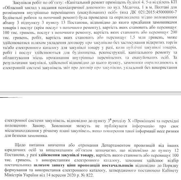 Крім того, ми запитували, чи департамент вивчав або отримував пропозиції від інших юридичних осіб у випадку із компанією «Укрбудпроектсіті», яка була новачком і взагалі не мала досвіду виконання державних замовлень. На що отримали відповідь – такого відбору не робили. Натомість використовували електронний каталог, де відбір відбувається шляхом запиту ціни пропозицій постачальників. Мова йде про електронний каталог Prozorro Market – свого роду інтернет-магазин, де постачальники публікують інформацію про свої товари чи послуги, а замовники їх обирають.