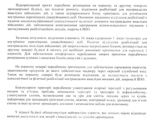 Як нам повідомили, скоригований проєкт передбачає – після проведення ремонту на першому та другому поверхах двоповерхової будівлі розмістять відділення реабілітації для постраждалих внаслідок військових дій, зокрема й ВПО. Усього у відділенні буде 34 ліжка (додатково 1 ліжко ізолятора).